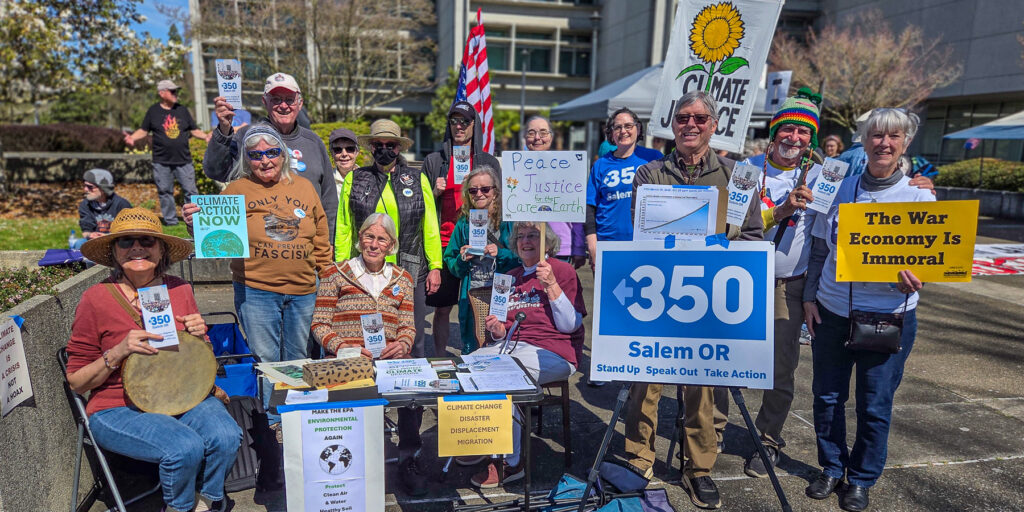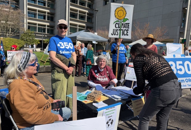 350 Salem members joined five thousand peaceful protestors at the Oregon State Capitol in March. A big thanks goes to the volunteers at our table who spoke with passersby about the need to stabilize our climate and protect the Earth.